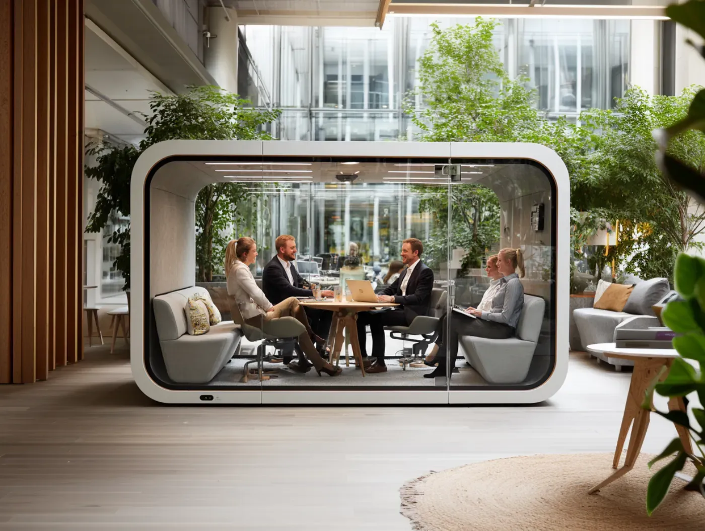 A meeting pod is a freestanding, enclosed space for private meetings, calls, or focused work—often sound-insulated and comfy. It’s like a quiet bubble in the middle of chaos, perfect for brainstorming without distractions.